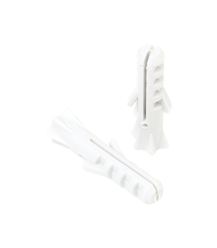 Chevilles en plastique adaptées à la plupart des matériaux pour ancrage sur murs pleins (Béton) ou creux (Briques). Ancrage solide par crants d'arrêt.